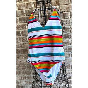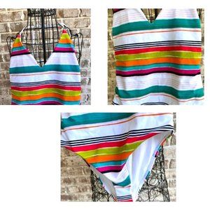LOFT Beach Swimsuit Size 4 Striped One Piece Halter Shelf Bra V Neck New Islands