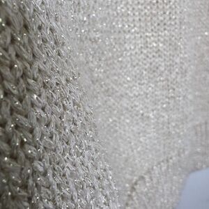 Versatile sleeveless knit tank top with metallic gold accents. Made from a soft beige knit fabric interwoven with subtle shimmering gold threads that catch the light, giving it an elegant, understated sparkle. Simple, straight silhouette with a scoop neckline and wide straps, making it great for layering or wearing alone.