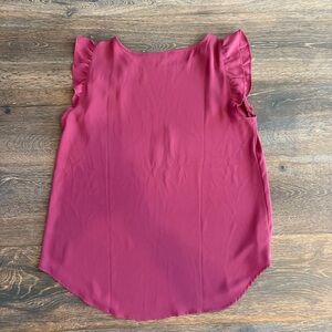 Sleeveless shell with delicate ruffle cap sleeves. Gold button accents along the shoulders. Smooth, drapey fabric in a rich berry shade. Easy to dress up or down.