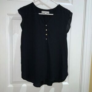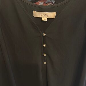 This elegant black blouse from LOFT features a classic buttoned style with a sophisticated touch. The blouse is designed with a comfortable fit, making it a versatile addition to any wardrobe. Its timeless design ensures it pairs well with both casual and formal outfits.
