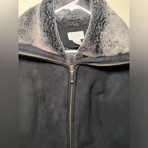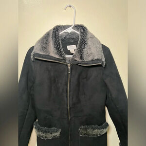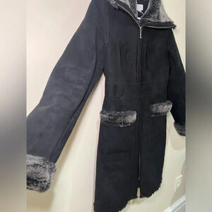 Stay warm and stylish with this elegant black coat featuring luxurious faux fur trim. Perfect for any occasion. Excellent used condition with full zip pockets in front. Suede and faux fur creates elevated look.