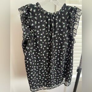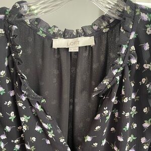 Sleeveless LOFT shell with ruffle trim at shoulders and neckline. Black base with small lilac and green floral print. Lightweight, feminine blouse for versatile styling. Lined and has a button keyhole front. Comes from a smoke and pet free home.
