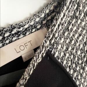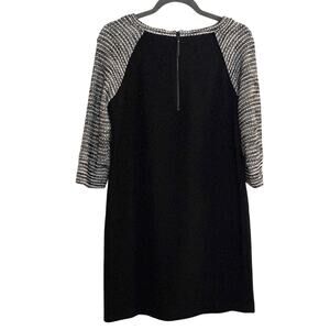 This versatile dress from LOFT showcases a chic crew neck and 3/4 raglan sleeves with a striking black and gray stripe design. The solid black body provides a sleek contrast, ideal for both work and casual settings. Crafted from a soft knit fabric, it ensures comfort and a flattering silhouette.