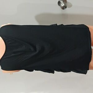 Chic black blouse with layered ruffles. Sleeveless design. Versatile and stylish.pit/pit 18" shoulder to bottom 22.5"