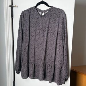 Chic black blouse with delicate patterns. Features stylish ruffle hem. Ideal for versatile wear. Loft plus brand that is no longer being made.