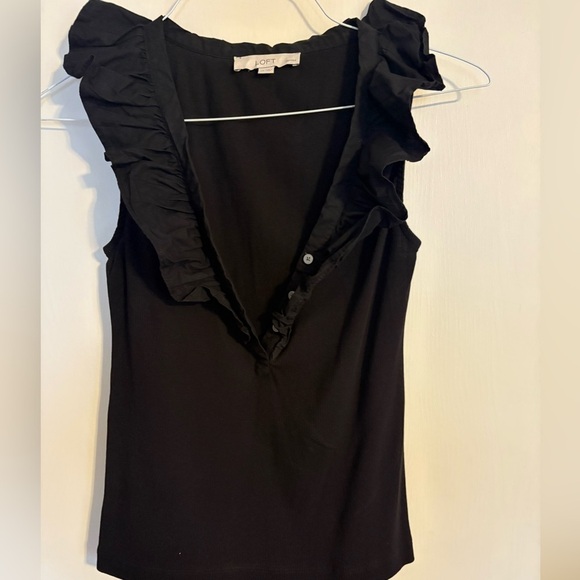 Chic black blouse with ruffled neckline. Sleeveless design. Perfect for versatile styling.