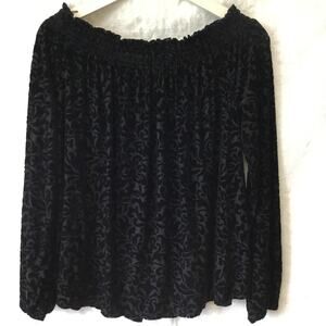 DESCRIPTION: This off the shoulder top has a velvet texture with flower designs.