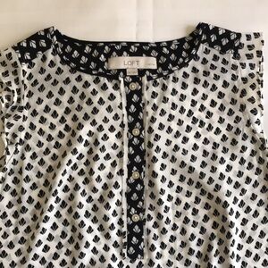 LOFT blouse, geometric print top, black white blouse, petite work top, Henley lightweight blouse, classic chic top, office casual style, effortless everyday, office casual