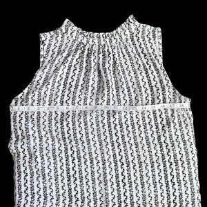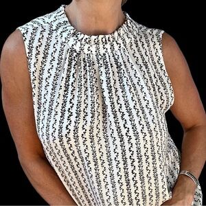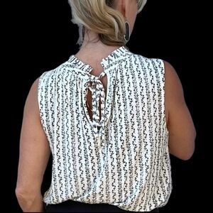 LOFT Black & White Patterned Sleeveless Blouse Size S (but roomy) with gathered crewneck in excellent barely worn condition! Ties in back with keyhole. See pictures for measurements.