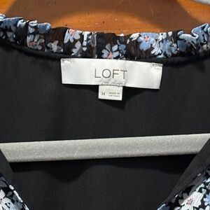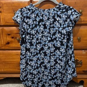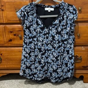 Chic blouse with a vibrant floral design. Features a black base with blue flowers. Perfect for versatile styling.