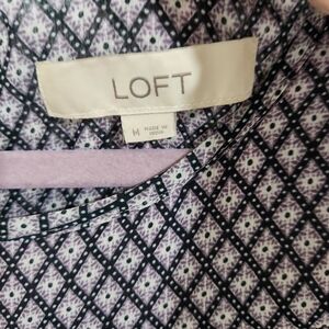 This elegant blouse from LOFT features a classic black and lilac color scheme with a smocked detail at the chest, offering a flattering silhouette. The cap sleeves and lightweight fabric ensure a comfortable and breezy fit, perfect for any occasion.