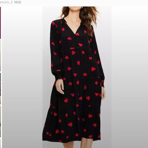 LOFT Black and Red Heart Print Long Sleeve Tiered Whimsy Midi Dress