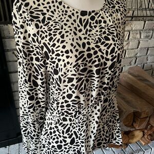 Elegant blouse with abstract black patterns. Soft fabric and long sleeves. Ideal for versatile styling.