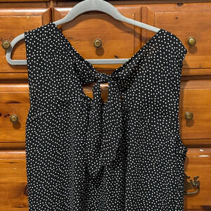 Stylish sleeveless blouse with polka dots. Features a charming bow at the neckline. Perfect for any occasion.