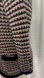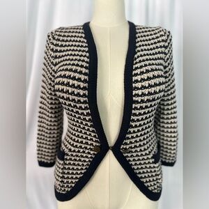 This LOFT cardigan features a striking black and tan horizontal striped pattern, crafted with a textured knit for added depth. The open front design is complemented by a solid dark trim, offering a chic and versatile layering piece for any wardrobe.