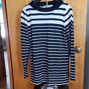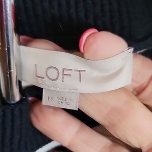 This LOFT sweater showcases a chic black and white striped pattern, offering a sophisticated touch to your ensemble. The crew neck design and long sleeves provide a classic silhouette, while the knit fabric ensures a cozy and comfortable fit. Perfect for layering or wearing solo, this sweater is a versatile wardrobe staple.