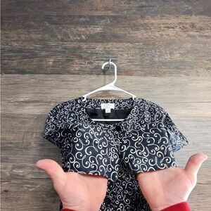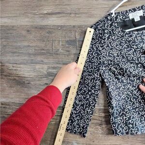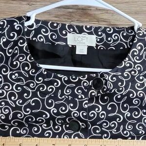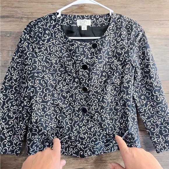 Stylish LOFT blazer with a black and white swirl design. Features button closure and elegant pattern. Perfect for adding flair to any outfit.