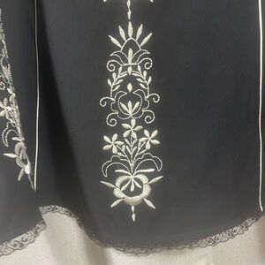 This knee-length skirt from LOFT showcases a striking black and white color scheme with intricate embroidery . Designed for cocktail events or a night out, it features a sleek silhouette that highlights its elegant style. The vertical embellishments add a touch of sophistication, making it a standout piece for any occasion.