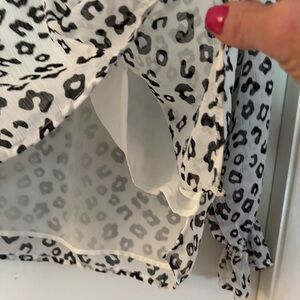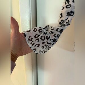 This stylish Pre loved blouse from LOFT showcases a charming ruffled design and a distinctive bib collar. The sleeves offer a modern touch, while the classic black and Cream leopard like pattern, palette ensures it pairs effortlessly with any outfit. Perfect for both casual and formal settings, this top is a versatile wardrobe staple.