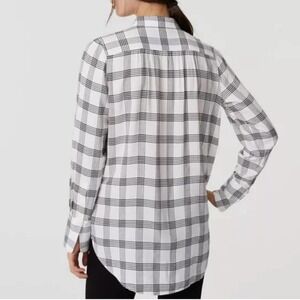 LOFT soft windowpane/plaid Shirt. Lightweight rayon plaid shirt trimmed at the V-neck. Button up front. Long sleeves with button cuffs. 100% rayon.