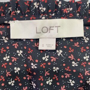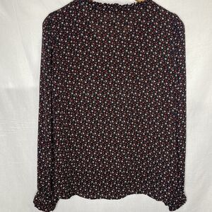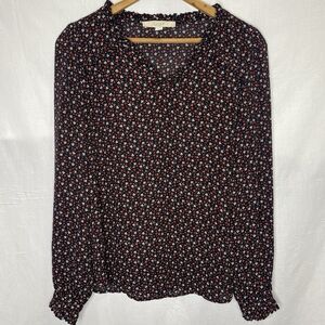 LOFT Blouse Floral Ruffle Trim V-Neck Puff Long Sleeve Pleated Womens S Black