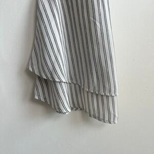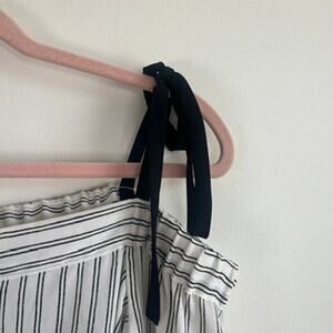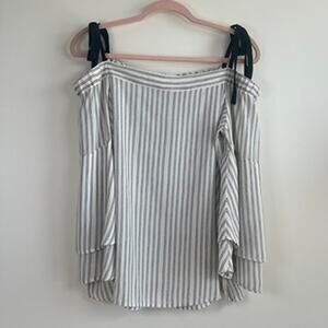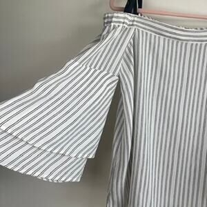 LOFT off-the-shoulder blouse in white with black vertical stripes. Features tiered bell sleeves and black ribbon tie straps for an elegant, feminine touch. Lightweight and flowy—perfect for work, weekends, or going out. In excellent condition with no flaws noted.