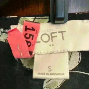 This blouse from loft is size small. It is black with a flower detail. What makes this blouse special is the ruffle detail at the neck and down the front. Also, it is sheer and on the front is double layer of material to prevent it from being see-through.
