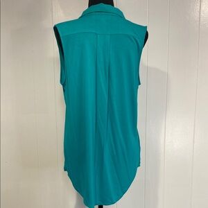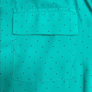 LOFT sleeveless blouse in stunning teal with charming black polka dot print. Features dual chest pockets and mixed media construction for elevated style and comfort in size Large.