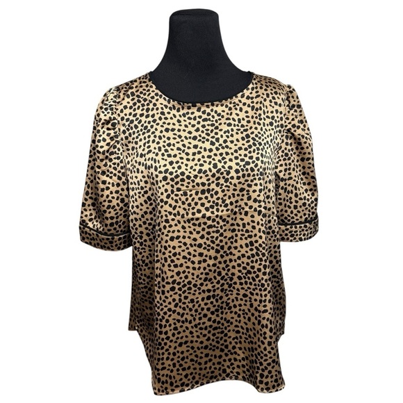 LOFT Blouse Top Cheetah Print Brown Black Short Sleeve Soft Silky Keyhole SZ L