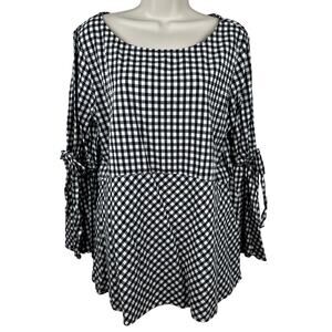 LOFT Blouse Top Plaid Gingham Check Boho Split Bell Sleeves Black White Women's Large Cottage Core