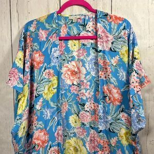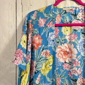 Beautiful LOFT floral kimono in a vibrant blue base with multicolor flowers. Lightweight and flowy, perfect for layering over tanks, dresses, or swimwear. Open front, short sleeves, and relaxed fit make it a versatile piece for casual wear or vacation styling.