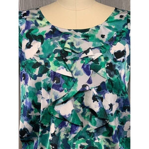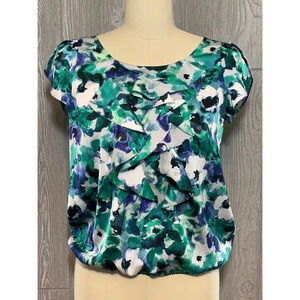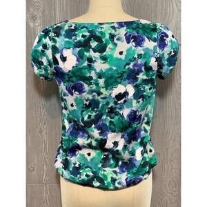 LOFT Blue & Green Floral Watercolor Print Blouse in Size Small Petite. Cap sleeves, ruffled front, and blouson front with elastic at bottom. Very good condition.