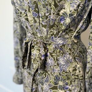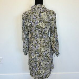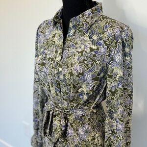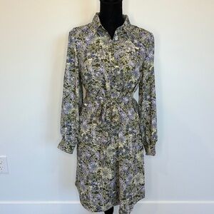 LOFT Blue Green Long Sleeve Collared Floral Belted Midi Dress (S)