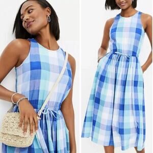 LOFT Blue Plaid Seersucker Midi Dress Size L