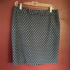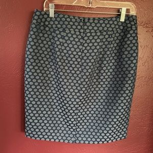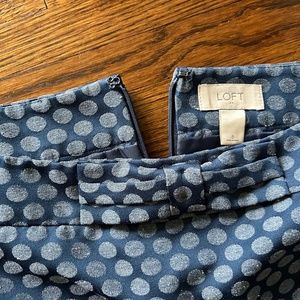 LOFT navy blue polka-dot pencil skirt with light blue dots and multi-colored accents throughout. Small bow in the front and zipper in back and interior slip lining. Women's size 8.