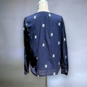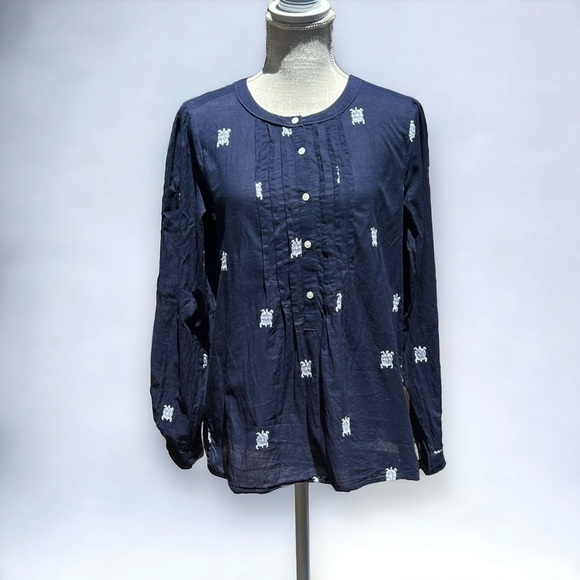 🌻LOFT Blue SEA TURTLE Embroidered Pleated Long Sleeve Lightweight Blouse Size S