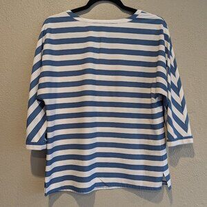 Design: Blue & white vertical stripes, v-neckline, 3/4 sleeves, relaxed fit