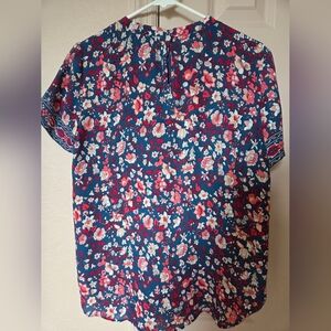 Charming floral blouse with vibrant colors. Features a round neckline and short sleeves. Perfect for casual outings.
