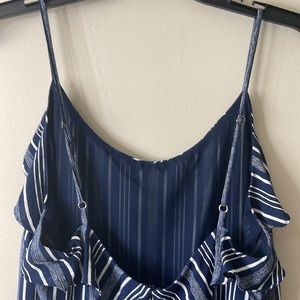 Stylish blue and white striped shorts. Features adjustable straps. Perfect for casual wear.