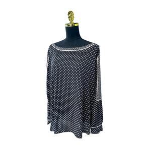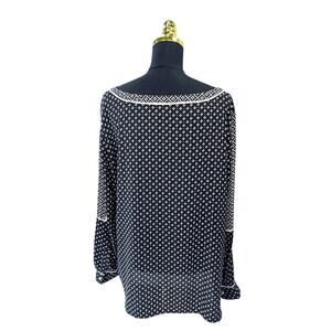 This LOFT boho-inspired blouse in size XL features a striking black and white mixed medallion print with contrast trim piping at the neckline, sleeves, and hem. Lightweight and flowy, it's made from 100% polyester and designed for effortless style. A versatile choice for workwear, brunch, or everyday chic.