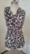 Chic blouse with a stylish animal print abstract giraffe pattern in chocolate brown and off-white. Sleeveless, button up (with cute covered buttons) and an asymmetrical collar. One side gradually extends into an elegant draped ruffle around the right half of the collar and chest. Cotton-y type of fabric, semi sheer, very lightweight and comfortable. Measures 28" across the bust and 25" in length. Wear it to the office or running errands. Great condition.