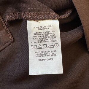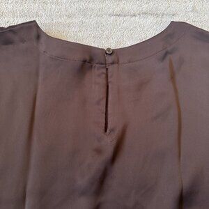Modern, minimalist, and polished, this lovely silky blouse includes short sleeves, pullover styling, and a keyhole button closure in the back. Color is a dark brown.