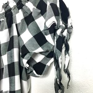 Off the shoulder dress from LOFT. Allover buffalo check pattern, and tie sleeves. Adorable for the summer! Some minor pilling in spots. Dress has small string belt loops on either side, but belt is missing.