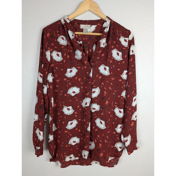 LOFT Burgundy Floral Split Neck Roll Tab Sleeve Blouse, Size S 182