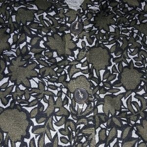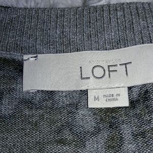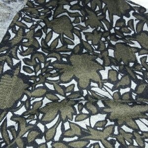 Lightweight, Loft Cardigan, with an olive green leaf print which is outlined in black on a gray backround. Size Medium. A great addition to your fall wardrobe! Worn once in EUC. Like new.