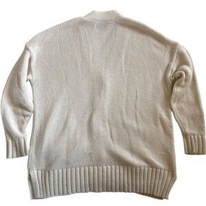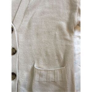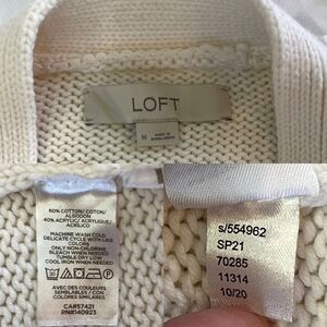 Cozy and classic cream-colored cardigan from LOFT. Features a chunky knit texture, oversized tortoiseshell buttons, deep front pockets, and ribbed cuffs and hem. Perfect for layering year-round!