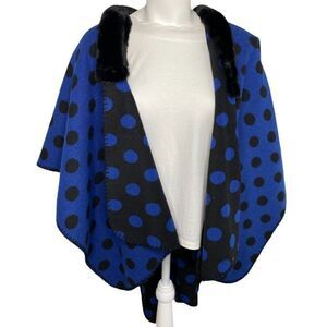LOFT Cardigan Wrap Women's MEDIUM Blue Black Polka Dots Faux-Fur Collar Draped