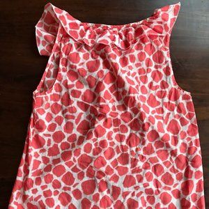 Great career sleeveless blouse in a pink and white animal print. Elastic waist to give a slight bubble look. Button down and a ruffle Y neckline. 100% cotton. Comes from a smoke free environment. No rips, stains or holes in the material and is in excellent preowned condition.