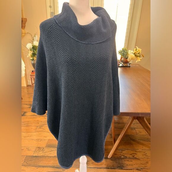 Chic and timeless Loft chevron knit poncho sweater in a soft black-gray blend. Features a draped cowl neckline, flowing poncho silhouette, and a textured chevron knit pattern for a modern boho-meets-classic look. Made from a cozy medium-weight cotton-rayon-nylon blend that offers warmth and structure without bulk.
