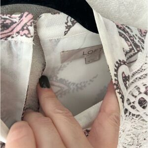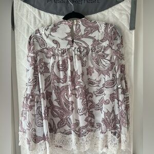 Pink white and grey accents- white lace. Paisley print. Bell sleeves. Keyhole button neck closure. Sheer Fabrication. Excellent condition absolutely stunning. 100% polyester except for lace trim. (HALL)